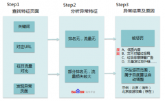1、分析流程图 流程图会按照三步来让站点确认到底是正常下跌还是异常下跌,在此站长第一步首先要找到特征页面 2、查找特征页面 首先说什么叫特征页面,即流量下滑比较多的页面,这类页...