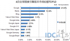 IDC评述网(idcps.com)05月21日报道:根据市场研究公司Net Applications最新数据显示,4月全球搜索引擎市场基本保持稳定。其中,冠军Google-Global份额以3.42%的增速继续猛涨,已升至65.73%。而亚军百度份...