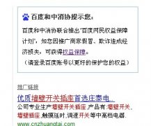 最近在网上搜索某些产品信息的时候,在百度搜索框右侧会看到《百度和中消协提示您:百度和中消协联合推出百度网民权益保障计划,如您因推广商家假冒、欺诈造成经...