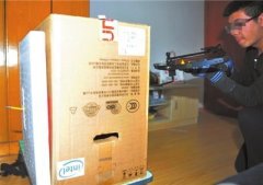 电棍射出的电流使A4纸张着火。本报记者陶冉摄 射钉枪被改造成可以射出空包弹。本报记者陶冉摄 记者试验飞针的威力。本报记者陶冉摄 记者试验时,弩箭射穿两层泡...