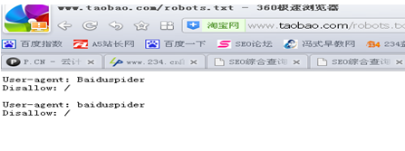 近日,打开微博时发现很多站长在讨论一个很敏感的话题,就是淘宝解禁了对百度的封闭!看到这个以后,笔者马上去查看了一下,果然,如下图所示,淘宝的robots.txt已经去掉了对百度蜘蛛的封闭!目前在百度上已经能搜到淘宝约24,700,000个网址了.