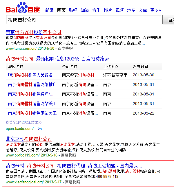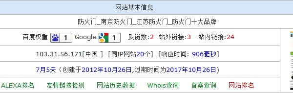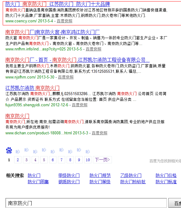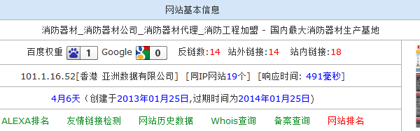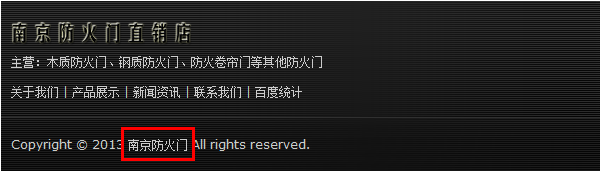 网站基本信息 网站关键词定位是“南京防火门”,当时在网站设计时就考虑如果把这个关键词合理布局到网站各个地方,网站底部次导航就是一个相当不错的选择,在这个益加上定位关键词锚链接指向自身,蜘蛛抓取完你整个网页时就是变相的在告诉蜘蛛这是我网站主要关键词。当然,可能有些人要做这个关键词没有什么竞争力度。的确,但是这个网站刚上线就已经获得了排名;至于你信不信,你试试看就知道了。 二、关键词定位:消防器材公司