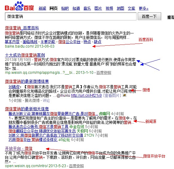今日下午无意中发现一个很奇特的现象,主要和大家探讨两个问题: 1、微信公众平台内容能参与百度排名吗? 2、如果能参与排名,效果怎么样呢? 请大家带着这样的疑问来阅读本文: 我们来先讲一下第一个问题:微信公众平台内容能参与百度排名吗? 搜索“微信营销”这个词的时候,点击下面的网址看了一下,突然发现几个奇怪的网址,当时仔细一看,竟然是 微信公众平台内发的文章,大家看下面的截图,看第二个网址
