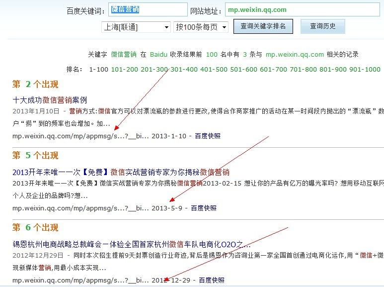 大家继续看下图:(你们懂的)然后用站长工具看了一下,大家注意看下面,搜索“微信营销”这个词,在首页出现了3个站,分别是第2,第5,第6,这三篇文章都是出自微信公众平台的内容