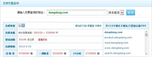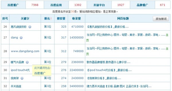 我们可以看到当当网的关键词排名情况,不仅有百度推广数据、还包含百度应用、开放平台、品牌推广等数据。而且这些关键词都会被注明排名、搜索量、收录量、网页标题等信息,尽管更深层次的数据我们不得而知,但这也足以让我们相信:这就是竞价排名数据库的翻版。