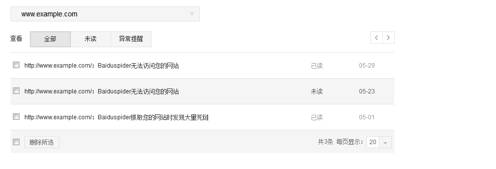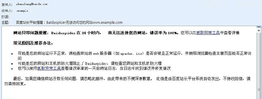 完成上述两步之后,当您的网站在百度中出现异常时,就可在站长平台消息提醒中查看到网站的异常信息,并会收到来自百度站长平台的异常提醒邮件。 消息提醒示例: