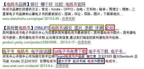 二 标题关键词和关键词之间的相得益彰。 在优化网站关键词的时候我们要认识到的一点是,并不是关键词放得越多越有利于吸引流量,也不完全是关键词放得越少越好越有利于排名。但从战略观的高度来看我们是可以这样理解的,标题关键词设置越多,关键词之间相互的贡献就越少。但如果能够保证存在多个关键词的同时,还能够做到所有关键词之间,形成良性的互相促进和贡献,这样的网站标题搜索引擎会进行加分,进而会使网站关键词排名得到缩短。 例子:搜索“电子书”这个超级热门词时,如下图所示是排在第19-20位的网站,第19位的网站在提供了“电子书”这种产品的同时,为购买或有意向购买的用户提供了论坛交流需求。再如第20名的网站在这方面做的更加到位,在提供产品的同时提供了购买产品的后续需求,即电子书内容的下载以及文学网站推荐。但它没排在首页也是有原因的,你打开这个网站就会发现,它提供的只是电子书资讯内容,并不直接提供电子书这个产品,也就是说没能完全满足用户的需求。