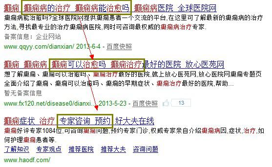 对于某关键词排名到首页所需要花费的时间,不同的人或不同行业的SEO会有不同的看法,长沙简子SEO优化也有自己的一些看法,希望能与大家分享!因为影响到某关键词排名的因素是多方面的,主要的不仅是受到关键词竞争程度的影响,更深入的说是受到行业竞争程度的影响。这里长沙SEO优化简子不具体解释影响排名的因素,而是从网站首页整体关键词排名的角度,来讲讲怎么写网站标题才能够缩短排名时间。 一 满足用户具有互补性的多样性需求。 用户在寻求、了解、购买某产品的同时,肯定会存在跟某产品相关的需求。如果你同行大多数网站只提供了这一项产品或服务,而你的网站除了提供这项产品或服务外,还为用户提供了与之互补的产品或服务,也就是说你的网站更多的满足了用户需求,搜索引擎便会对你的网站进行加分处理,进而会缩短你网站的排名时间。这也是我们说的差异性定位分析,因此我们在写网站标题的时候,可以根据这种思维进行差异化处理。 例子:搜索“癫痫治疗”在搜索引擎首页前三如下图所示,前两名的标题设置相似度大于九成,甚至可以说是一个模子刻出来的。但第三名的标题“癫痫症状 治疗 专家咨询 预约”不仅满足了了解治疗知识的需要,而且满足了症状知识的需要,更重要的是满足了患者直接去预约医院治疗的最终需要。相对而言这样写出来的标题,更加受搜索引擎的亲睐,也更加容易引起癫痫患者的关注和点击。