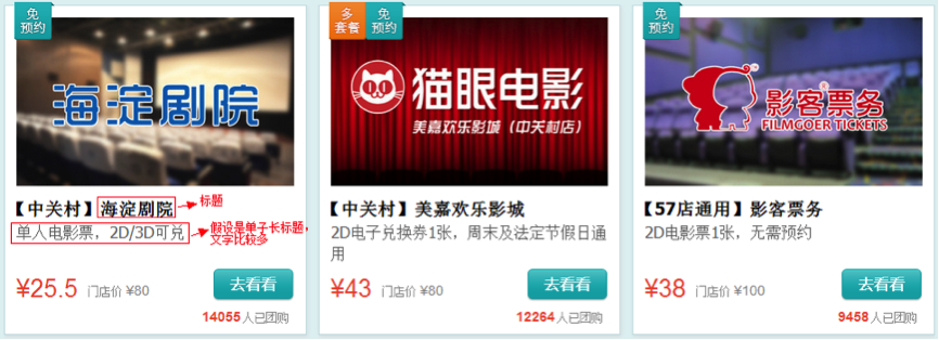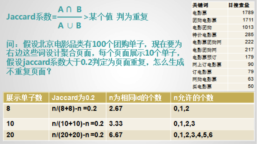 反推Shingle算法,如果Jaccard系数小于某个数,就不重复了,先给每个文档集合拆分成若干个Shingle,再两两计算Jaccard系数,如果小于某个数,生成页面即可。 我之前做的一个项目使用的一个方法,虽然比较笨,也还算实用,分享一下: 假设北京电影品类有100个团购单子,现在要为下图右边这些词设计聚合页面,每个页面展示10个单子,假设jaccard系数大于0.3判定为页面重复,怎么生成不重复页面? 如下图展示单子的标题和长标题(假设seo聚合页用的长标题,因为长标题文字不单一,文字量也大):