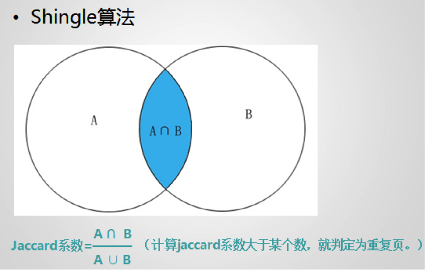 对于长度L的文档,每隔N个汉字切一个Shingle,这样一共切到L-N+1个shingle,A文档标题切成了L-N+1=21-2+1=20个Shingle,B文档标题切成了L-N+1=20-2+1=19个Shingle。 A、B两个文档标题共同的Shingle有图上7个加粗的:电话、话订、火车、车票、全国、国通、通取。 A、 B两个文档标题一共有20+19-7=32个Shingle。 然而,A、B两个文档标题共同的Shingle,除以,A、B两个文档标题一共有的Shingle,就是这两个文档标题的Jaccard系数,可以用来判断A、B两个文档标题的相似度。 A、 B两个文档标题的Jaccard系数=7/(20+19-7)=0.21875 从两个文档的标题,可以延伸到两个页面文档,再延伸到N个页面,通过Jaccard系数是否达到相似所需要的标准来判断页面与页面是否相似。 这就是Shingle算法,两个集合的交集除以两个集合的并集,得到Jaccard系数,通过判断Jaccard系数是否大于某个数,来判断两个集合是否重复。