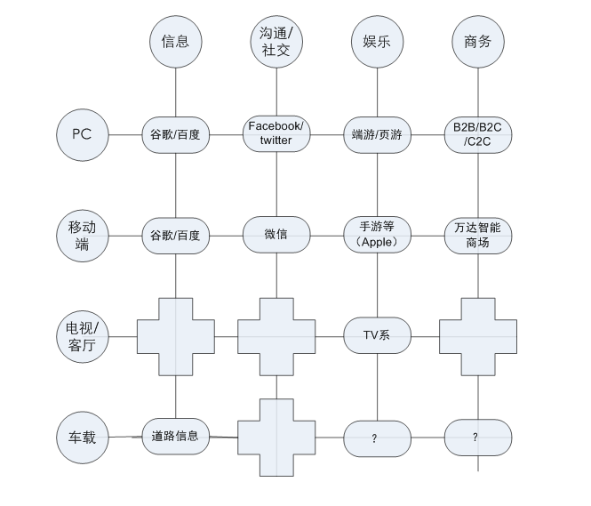 第四,如果跟巨头没有硬碰硬,没什么好怕的,生活服务的互联网化还处在一个比较早的阶段,有一些资源肯定有优势,但未必一定是好事儿。尤其是一些细分垂直领域。大树底下种花儿行,要种树就不太有戏,巨头嘛,不太容易从零开始。 8、O2O被炒得这么热,站在风口上,有什么感觉? 大家比较关注这个行业,可能和最近BAT这些巨头都在这个领域有比较大的动作有关。另外,资本也开始进入这个行业进行一些卡位投资。资本的进入和市场的关注肯定是一件好事情,因为这会推动行业的发展。相比其他创业团队先拿到融资,证明了现阶段我们比较领先,资本也比较认可我们。 但是,生活服务行业的互联网化是一个比较长的过程,市场的培育和行业的竞争都会持续相当长的时间,所以,我们也做好了打持久战的准备。 9、除此以外,还有哪些值得期待的? 用户使用某个产品和做某个消费决策的时候是非常具有场景化的。这个趋势正在越来越明显。 我个人非常赞同王兴的四纵三横理论,套用这个方式我觉得使用场景也可以转变为四纵四横的框架,四纵分别是:信息、沟通/社交、娱乐、商务。四横分别是:PC、移动端、电视/客厅、车载。这样你就可以大致分辨出,用户会在什么场景下使用哪些产品和做出哪些消费决策。