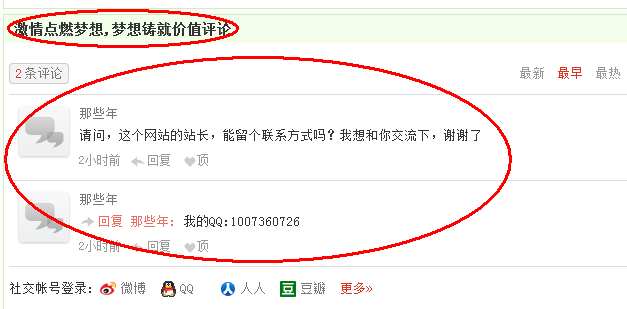 因为他久久没反应,我就在文章的末尾添加了自己的评论,我想叫他加我QQ,但是我没说明具体的事情。