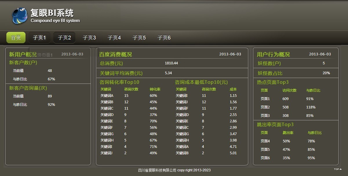 不足:首先商务通并不是专业的BI(商业智能)系统,而是客服系统的一个辅助功能。其次,虽然商务通能统计到咨询转化率以及咨询成本,但是不一定所有电子商务网站的转化率都用咨询来判断,有部分用户和网站只会发生少量咨询而更多的情况是直接注册会员或者下单,而商务通无法统计这些行为。 方法3 复眼BI系统(WBI) BI是商业智能的缩写,系统又分为数据挖掘、数据仓库、数据分析3大结构组成。可以这样理解,复眼BI系统是电子商务网站的眼睛。通过这套系统,至少可以解决3个问题。 1. 关键词效果分析 通过复眼BI系统,可以直接看到这些数据:关键词点击次数、关键词点击率、关键词咨询次数、关键词咨询率、关键词点击成本、关键词咨询成本。 2. 访客行为分析 通过复眼BI系统,可以将所有入站用户的行为统计和细分,从而分析出网站缺陷,提升用户体验。例如:某个产品页面,大部分用户的停留时间都很短,或者在该页面的出站率非常高。 3. 访客行为统计 通过复眼BI系统,可将访客的行为按我们需要的规则进行统计,从而为我们的决策提供帮助。 例如:重复咨询率很高,那么我们可以考虑是否是我们的客服不太专业。大部分咨询发生在第三次访问,那么或许是我们给用户的形象相比其他竞争对手并无太大优势,而导致用户反复对比?