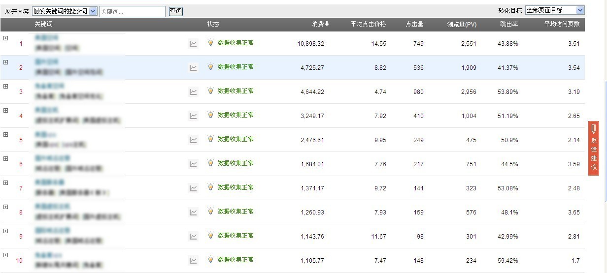 那么想要进一步分析关键词效果的话,可以从百度后台的转化统计里面看,从第一个图中我们可以看到,从会员注册,注册成功,有的客户安装的是付款页面,这些数据是不准确的,而且误差很大,新客户或者老客户进入网站,是很有可能浏览付款页面或者注册页面的,但客户却没有真正购买产品,而只要访客浏览了这些页面百度会记为一次转化,这里笔者经历过一个有趣的现象,当天看到后台转化量是58,但是却没有一个客户注册和购买产品。有的用户可能会问,我可以看关键词的咨询次数,这里笔者和销售人员经过实际的测试,访客从百度前台点击关键词进入网站浏览后点击对话框,这里百度会记为1次,客户不想咨询了关闭对话框浏览其它的网页,然后又咨询百度也会记为1次。这些数据的误差在一个长时间的数据积累下是会导致用户模糊和分析错误的。 不足:百度自身的统计往往看起来数据庞大,然而并没有将错综复杂的数据关系有规则的梳理,大部分数据看似有用,但是在实际使用中,大部分数据都给用户一种雾里看花的感觉。用户利用百度自身的统计分析出的结果,往往准确性不高,导致用户总是感觉是靠直觉在做决策。 方法2 商务通 商务通是一种在线客服系统,在国内拥有大量的用户,尤其是医疗行业。究其原因,主要是因为商务通可以变相的统计百度竞价的广告效果。 具体做法是将每日的百度统计报表导入到商务通的系统中,商务通将百度统计报表中的关键词点击数和总消费与自身记录的某关键词咨询次数对比,合并成一张表。从而得出该关键词的咨询转化率以及该关键词的咨询成本。