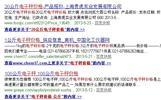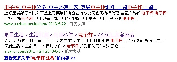 最近大家在百度搜索某一个关健词的时候会发现好多网站点击标题以后,百度的搜索框会出现查看关于更多的这样的显示,然后点击自己的网站却没有,所以好多人说这个是大网站(高权重网站)才享有的权利,一般的小网站(企业站)是不可能有这样的待遇的,我也看过好多关于这方面的的文章也是传达这样的意思,为了避免有些朋友被进一步的误导,这里有必要更正一下,不是这样的,所有网站都可以,不管是大网站,还是一般的企业站,为什么好多人会这样认为呢,原因是大家搜索习惯的一个误区造成的。 好多做SEO的朋友当去百度搜索关健词排名的时候,一般都搜索的是核心关健词,也就是指数相当高的词,而对于一些长尾的词则很少去搜索,如当我搜索我们行业的关健词电子秤(指数408)的时候,出现的排名展示,一个是我们公司上海速展衡器的企业网站,另外一个是凡客诚品的网站,也就是说这些核心关健词的排名中,除了企业站以外,还有好多第三方的B2B或B2C网站,像什么阿里巴巴,凡客诚品,库巴,亚马逊等这些。