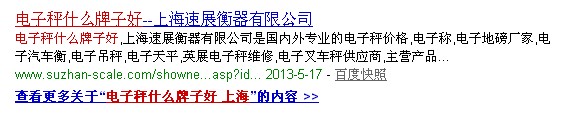 看上图,同样是我们公司上海速展衡器的企业网站,一样的出现了吧,所以并不是大家误认为的大网站才有,小网站就没有了,但是说到这里,在这样的展示中,大网站和小网站还是有区别的,小网站出现的这个查看更多的相关内容都还是提示的也就是说你点击以后还是全部是百度的内容,如果是很好的大网站会直接定位到该网站的相关收录的百度内容了,话有点绕,还是看图哈