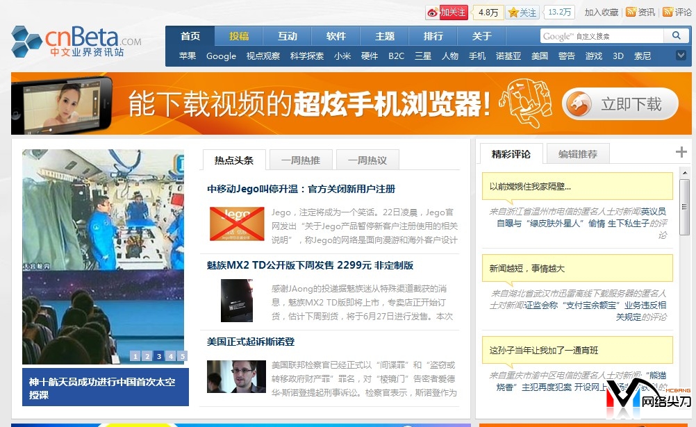 当科技门户纷纷转投科技博客这张脸的时候,常年致力于博客展现模式的cnbeta网站终于做出了自己的改变,有人说CnBeta是Digg风格最后的遗迹,而面对日近月新的互联网格局,CnBeta最终还是未能守住自己的风格,就在今天CnBeta又以门户的框架站了回来!如果说每一次改版都是一次巨大的飞跃,显然CnBeta这次一定做出了十年内最大的改革。