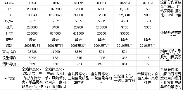 我们做seo优化非常容易惯性思维,就是凭借经验去做。由于搜索引擎算法的不断更新,很多已经过时了,所以合理借鉴同行优秀网站,对于提高优化的效率和针对性就变得非常有用了。随着公司的发展要求,改版提上了工作日程。下面和信就分享下如何合理借鉴同行网站优化自己网站方法。 怎样确定我们的借鉴的网站?目标网站并非就一定是同行业的前几名。而是根据自己网站的定位去选。比如针对搜索引擎优化优化的话,那就应该集中在那些搜索权重高的网站上。获取的方法很简单,我们就通过目标关键字到各大搜索引擎搜索,找出排名靠前的网站。这些就是我们的目标网站。接下来我们该从哪些方面去分析它们? 首先第一步建议先整理网站的基础数据。这部分涉及域龄、快照、外链、收录、Pr/Br、ALEXA等,通过这些基础数据先了解这些网站大致情况。为下面的分析排除一些不必要的干扰因素。