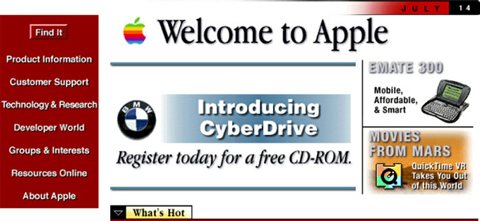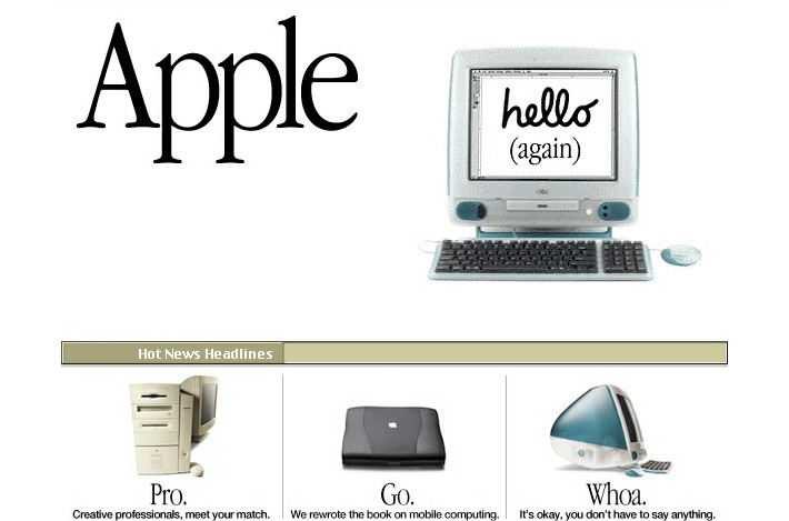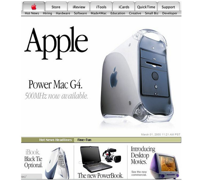 Apple 1998: 已初具apple网站布局的风格。简洁明了的视觉风格,上下结构,上部大幅产品banner海报+下部三栏形式的产品展示。