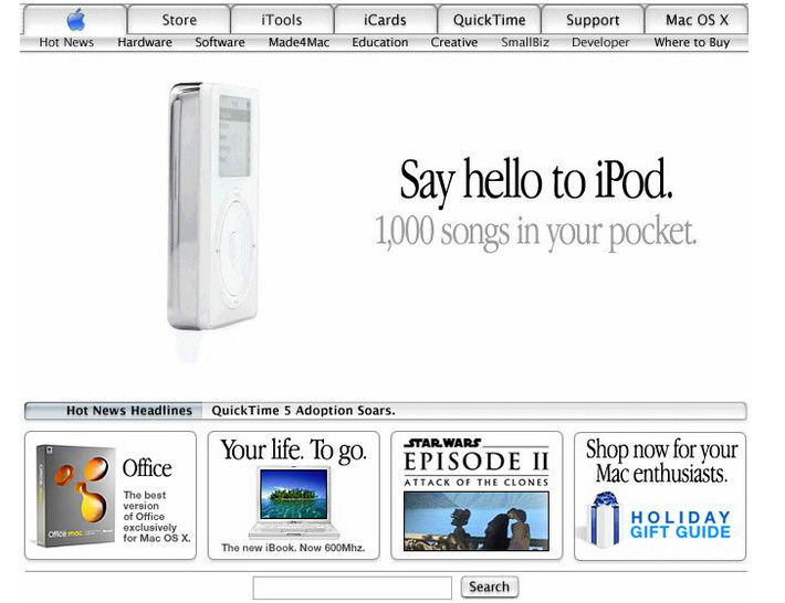 Apple 2001: 导航的视觉和交互形式并没有发生太大的变化,只是将红色的logo换成了蓝色。并延续白色玻璃种感到整个网站界面和控件。 你会发现,包括搜索的按钮等控件都做了圆角玻璃质感的处理,并且配图的外框也否相应地做了圆角的处理。 PS,当年装1000首歌的岁月。。。