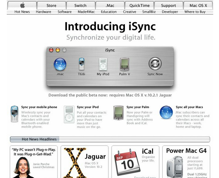 Apple 2002 导航的系统logo的颜色换成了灰色,玻璃质感的渐变也做了不少的调整。还有值得注意的是iSync面板的金属拉丝质感。