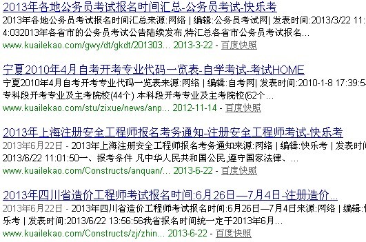 网站被百度惩罚是家常事,但是百度不会随便去惩罚你的站,最大的可能就是你触犯了百度的规则,当你的网站收录减少,快照不更新,site主页不是在第一页,关键词排名突然掉了,那你的网站一定被降权或受到惩罚,面对这样的情况,站长们肯定急了,许多站长们认为要加强原创文章的更新,快点让网站恢复权重,其实这个方法并不是理想的方法,下面笔者以自己的经验来讲讲新站被惩罚的实用解决方法。 做301跳转的网站请忽随便改动 笔者有个教育考试网站快乐考,因为这个站是做过301跳转的,老站是2009年起步的,后面因各方面的原因就重新注册域名换站了,于是把老站做301跳转,但是百度对301的处理技术不是很高,新站的快照迟迟不更新,反而老站快照天天更新,时间过去了一年了,网站还是这种情况,快照不更新有半年了,于是笔者把网站的301跳转取消了,就在取消一个星期后,网站突然收录减少了1000个页面,site主页不是第一位,就搜“快乐考”这个词主页排名都不见了,所以这明显是被百度降权,于是我分析了各方面的原因。网站收录减少,说明我们的原创内容不是很高,又是新站,权重不是很高,以前所有的东西被百度认为是垃圾,所以把以前收录的页面都从文章中清除,其次就是突然取消了301跳转,以前的老站也有权重的,在百度站长工具中,老站的页面也被认为是一条反向链接,收录了多少页面,就有多少条反向链接,突然一下子取消,外链一下子都掉了,所以这会引起百度的注意。 文章更新如何是好? 网站被降权,还有一个因素也考虑到了文章的原创性,网站原创度不够,但是一个教育网站你要去人工一篇一篇地写,那基本上是不可能的事,只有原创加伪原创,文章还是得去互联网找资料,那笔者网站就是这样实行的,文章伪原创,去百度新闻搜索笔者想要的关键词文章,然后把这篇文章去百度搜一下,看同样的文章出现了多少个页面 ,页面越少,说明这篇文章在百度数据中不是多,可以好好利用,页面多的话,那站长们最好不要用了,因为太多一样的东西,百度是不会收录你这个没有权重的站。然后自己动手修改下,标题是必须改的,删除文章中无用的语句,加上实用的词语。这样百度目前的技术会认为你是原创,虽然其它网站也有这篇文章,但百度会认为两个网站都是原创,最好的证明就是文章收录后,你会发现前面有的文章是有时间的,有的文章却没有,这是最好的证明。如下图所示,有的文章前面有时间,有的却没有。