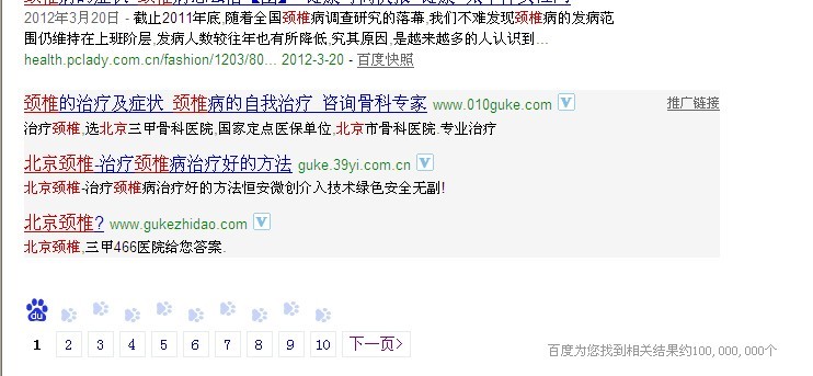 一直说网站优化其实是网站运营里的生活尝试,经过无数次的失败和成功换来的。在我们身边错别字的输入习惯应该不难见到,所以也是网站优化的一种。 今天和大家说说从生活操作中得出来的小经验,我们做网站运营的时候会去了解竞争对手,看看多少企业网站或者同行门户已经比你高高在上,看上去无法再超越了。比如医疗行业,前20页基本都被同行业网站优化工作人员给做站群了,怎么点都是同一个医疗公司,那么今天我们从细缝里寻找生存的妙招。 首先我们可以百度下“颈椎”这个词,专业的可能一看这个词的搜索“百度为您找到相关结果约100,000,000个”(当然今天我只是举例,数据并非正确)那么可想而知你要优化这个词的难度系数有多大,有多渺茫。