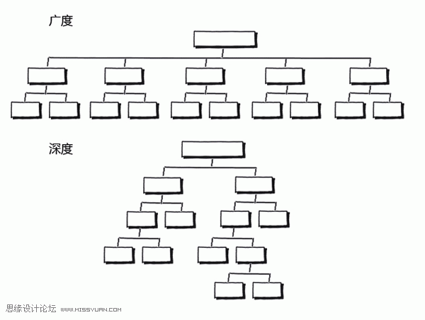 2.扁平结构还是纵深结构 如图,为什么搜索引擎提倡扁平结构,因为扁平结构只需要用最少的点击次数就能够达到目的地,而纵深结构就要多次的点击才能达到。这就让搜索引擎蜘蛛更不容易达到目的地,更重要的是用户如果要点击4-5次才能达到目的地,很容易提高跳出率,所以搜索引擎鼓励站长们要创建扁平结构的原因。