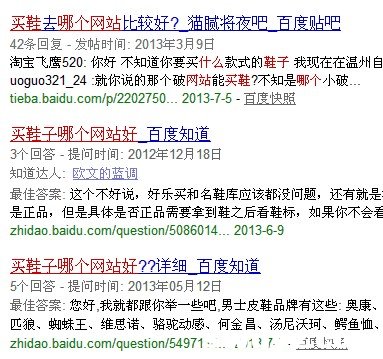 算法调整之后 相信大部分站长的网站排名和笔者的一样也出现下降的情况。另外就是网站的内页排名比首页的好,可以说是比较混乱的一种现象。 像一些以前做起来很简单没有人竞争的词语也开始下降,不得不让笔者开始怀疑百度自身的问题严重。可以这样说:现在百度搜索到的内容不如调整之前搜索到的好。因为现在你一搜索的话出现的都是百度自身的产品,如百度知道,百度贴吧和百度文库等,只要你一搜索热门词语百度的产品就会很多了。如你去百度搜索“买鞋子哪个网站好”,出现的全部是百度知道和贴吧在首页。如图