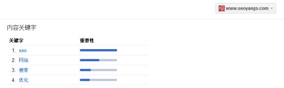 内容相关性 什么是内容相关性 每一个网站都会有自己的一个主题,即使大型的综合网站,也会围绕几个词展开其内容的撰写与发布。在辅以相关性高外链的支持下,久而久之,在这个领域,这个网站就成了权威,拥有了高权重。比如,杨氏SEO博客是以SEO,网站优化和搜索引擎为主题的博客。那么理应在搜索引擎的数据中,这三个词占据着主导地位。 这就是内容的相关性,我们可以通过谷歌网站管理员工具看到: