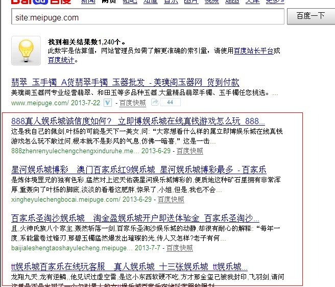 发这个帖子的目的是从自己的亲身经历,来提醒广大做SEO的朋友们,一定要避免因为网站安全性给自己的网站优化带来影响。 平时我们说的网站安全,一般是指网站程序有漏洞,或者服务器有漏洞,被黑客攻击加黑连等。今天我要讲的是域名安全。 公司网站出现的情况: 公司的一个网站各大搜索引擎排名一直不错。在7月15号左右的时候查看站长统计,发现流量大减。在查看流量来路时,发现从百度没有过来任何流量。百度排名全没有了,用站长网工具查看网站百度权重,为0,流量为0。 排查可能的原因: 我在思考最近除了给网站每周更新几篇文章外,没有对网站做过任何改动。外链也从来没有发过。然后检查是否是网站被黑了,被挂了黑链,经检查没有。查网站收录,发现带WWW的网址收录900多,不带WWW的收录1200多。一查,发现了百度收录了大量的二级域名,而且全是赌博,美女聊*室之类的页面。如下图:
