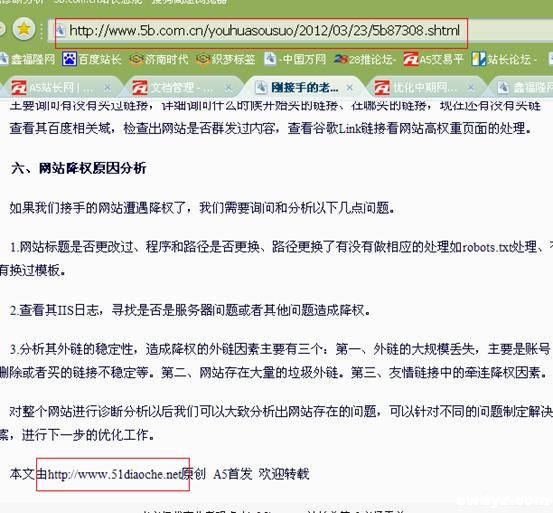 有很多人认为纯文本的网址做外链是没有作用的,对网站是没有贡献值的,其实是错误的,自从百度站长平台推出外链查询功能,我们做外链的针对性就更加强了,我们能知道哪一些外链是能够被百度识别并计算权重的,当你在A5平台上发表一定数量的文章的时候,会有大批的网站、博客去转载、采集你的文章,因为文章中有你留在底部的网址,他们在转载的时候就会给你加了一条外链,这样的自由传播外链是能够被百度识别并计算的。(如图)我在A5发的一篇文章被某网站采集过去并留有我的网址