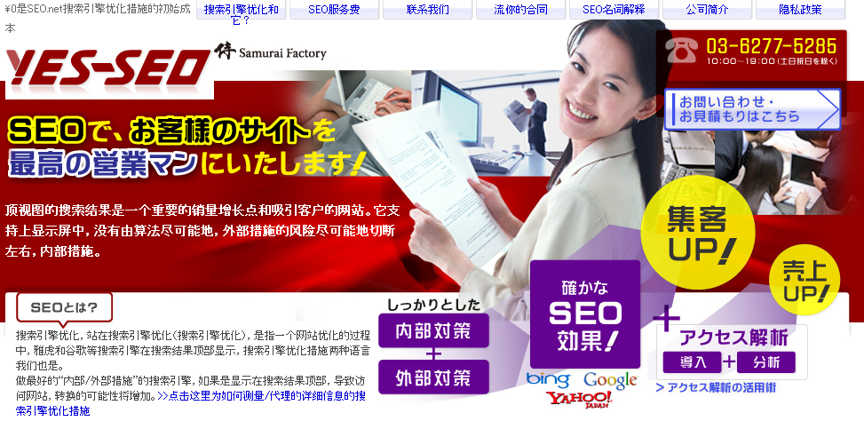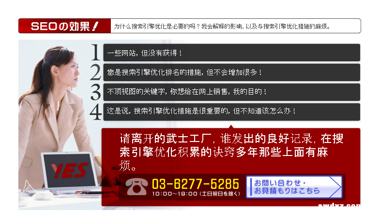 主页2-翻译3.主页的BODY部分,依然是美女抢镜外加seo的4点理论。这里想要表达意识就是针对一般的企业网站没有良好的收录和排名情况下,seo的至关重要和联系方式:03-6277-5285工作时间在上午10:00-下午17:00!日本的seo工作时间居然只有7小时..........再次震撼了!