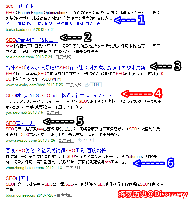 百度自然排名结果我们来看百度自然排名的结果情况。蓝色的1号和6号箭头是百度产品,排在第一面无可厚非,况且百度百科的权重和文章质量最高,排在首位是没话说的。其次,在第二位的站长工具是我们seo人员必须使用的检测工具之一,知名度高,适用人群广,众多站长使用站长统计工具,从而给站长工具带来巨大流量和反链。第三位是国内名气最高的seo论坛,注册人数多,原创性非常高,学习和讨论seo的学员和工作者都很喜爱。 第四名:SEO対策のYES-SEO.net - 株式会社サムライファクトリー。等一下站长我将全面的剖析这个神奇的日本网站,怎么爬到百度第四的,这让我们国内企业情何以堪啊第五名是非常人王,ZAC的SEO每天一贴,读过seo实战密码的同学都知道,zac是国内研究seo第一人,也出了几本有价值的参考书,但是zac已经3周不跟新了,名次下滑。 在日本,雅虎日本是第一牛叉的,谷歌都要一边站着。站长我特意去雅虎日本一看究竟