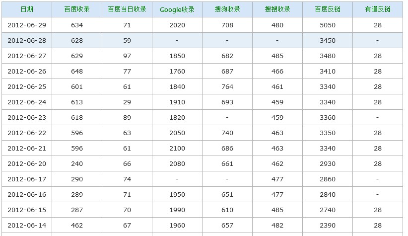 今天是6月的最后一天了,相信很多seoer都希望这黑色的六月快点结束,起因就在于六月二十日左右开始的百度大地震,大部分网站在没有任何预兆的情况下,网站快照回档,快照不更新,收录和外链猛降,排名猛降,网站被K等,同样,笔者的网站也不幸中招,沦为此次百度大调整的牺牲品。今天,笔者也和大家分享一下这十天内的数据,相比于其他排名下降的原因,可能笔者的网站数据有点另类。 下面为大家总结下笔者公司网站的异常情况及各项数据,仅供大家参考。 1.网站异常开始日期6月19日,具体表现为,主关键词排名下滑到30到40名之间,个别副关键词已迭出一百外,大变动日期为6月20日,网站权重降为零,网站主关键词和副关键词排名全部迭出一百外。至今未恢复排名。 2.不同于其他网站的是,很多网站伴随排名下降的是收录猛减,反链猛减,所以很多人把原因归到这两点上了,而笔者的网站却是收录和反链却不断的持续增加,可以说是猛增,而权重和排名依然没有恢复。这一点也可以算是此次网站排名下降波中的另类了吧! 下面为收录和反链数据图: