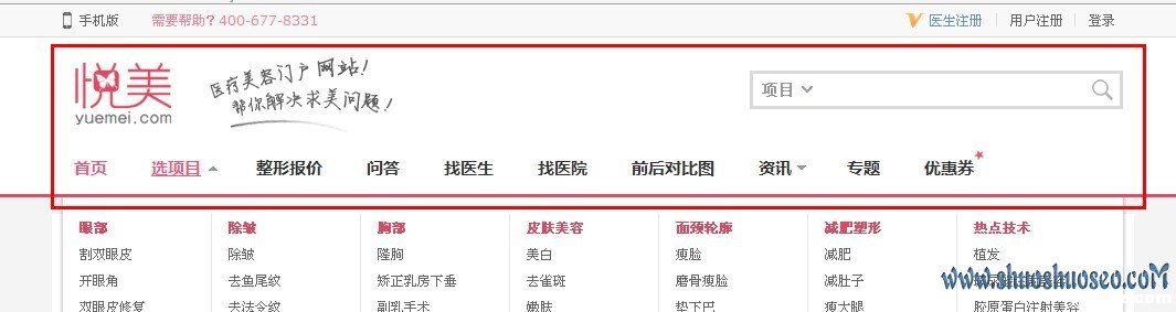 导航的设计离不开用户需求 导航到底是怎么去设计,是可以根据自己的评测去进行吗?如果你根据这个去设计,我只能说你的用户会离开你。我在《网络营销策划,算个球啊》 中详细对于怎样考虑需求去进行网站营销策划大致的说明了一下。其实网站导航设计也是离不开用户的需求。怎么去做呢?你可以参考一下百度相关搜索关键词去进 行布局。比如说,整形。你到百度搜索这个关键词你会发现百度首页出现了什么。是不是出现了百度知道、医院、以及一些与整形相关的项目。出现百度知道说明用 户有问答的需求。其他两个也是我们需要去挖掘的。这样你看看悦美网的布局也就感觉是非常合理的了。