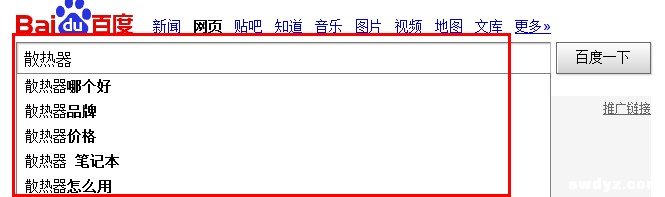 2、百度下拉框:笔者在百度上搜索某个关键词会出现下拉框,下拉框里出现很多文字,这些文字几乎都是长尾词,然后笔者可以搜集起来,如搜索散热器,下拉框会出现散热器品牌、散热器价格等长尾词。