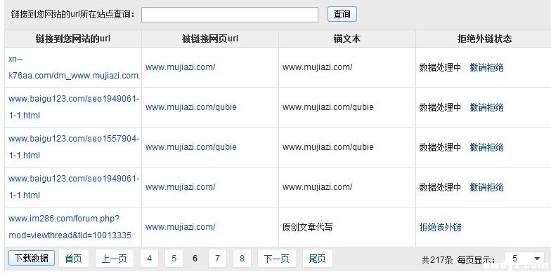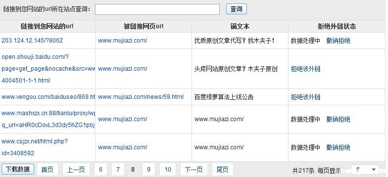 小木并没有做过外链建设,至多是在站长论坛上发过几条业务帖,但从上图中可以看到,虽然外链数量并不多,显示为217条,但对于从没有主动做过外链的网站来说,这个数量足够说明问题了:你没有做,不代表不会产生外链——不管你乐意不乐意。 百度拒绝外链工具的好处是:不管是什么原因所产生的外链,只要你不乐意,你就可以拒绝。拒绝了会怎么样?顾名思义,当然这条外链将在百度的权重计算中作废。不过要明白一点:这条外链是客观存在的,只是百度不将其列为投票因素而已。 外链数量不是太多的话,你完全可以在链接到您网站的URL一栏中挨个的点击查看链接源网站的优秀性,然后随心所欲的留下你认为优秀或应该留下的URL,其他的就拒绝掉。