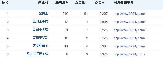 第二,分析用户的搜索关键词。由图可知,笔者主做的词,蓝田玉无论是搜素量还是展示率都遥遥领先这个毋庸置疑,因为搜索蓝田玉笔者网站是百度第一的位置,所以这个词流量价值也是最高的,我们接着看下面蓝田玉手镯,蓝田玉价格蓝田玉鉴别,蓝田玉手镯价格次之,这些长尾词也是笔者目前着手优化的重点,虽然流量和点击远远小于主关键词但是为我们文章写作和长尾词建设提供了积极正面的帮助性的东西,这些也是百度站长工具在提示站长,对于自己可能没有发现的长尾词,后台一目了然的显示出来,后期我们只需要加大内容建设和相关文章中长尾词如何有效的布局和监控对于长尾词的突破也不是非常困难的。从这个图笔者认识到了,网站优化过程中不仅仅要抓住西瓜芝麻也是要多多关注的,因为无数的芝麻才会牢牢的稳固我们主关键词在百度的表现,提高主关键词的权重。