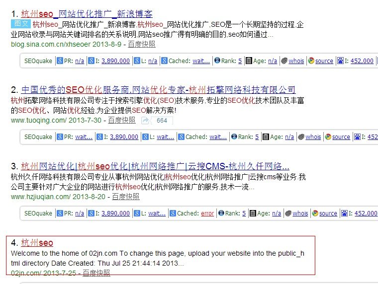 如上图我们不难发现,百度最近所谓的周更半个月才更新一次,没有了以前的所谓的周更,每月一大更的趋势;并且大家如果去查看一下数据就可以发现,以前的周四晚上周更基本上规律荡然无存了,增加了百度周更的无规律性,此为反常行为一。 2、8.20号百度快照和排名数据回档 昨天中午杭州seo寂寞哥查看自己网站site:02jn.com,百度快照是在近期的8.15,关键词时没有排名的,而昨天晚上在家里寂寞哥查询了下网站,突然惊讶的发现网站不仅快照回档了,网站杭州seo也是回档了,排到百度首页去了。