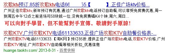 笔者进入seo行当已经5个月了,这段时间都在思考一个问题,seo是什么?当然如果从字面来看,seo就是Search Engine Optimization,也就是中文意思的“搜索引擎优化”。但笔者不只是想知道如此直观的答案,于是作为一名愚人,笔者继续在深思“Seo是什么?!” 通过这几个月的工作,笔者发现自己所撰写的那些行业性文章的作用其实是很明显的……从不懂得加锚文本的意义与作用,到深知如何推动一个关键字上升,笔者感概原来可以通过这样一种手段让潜在消费者寻找到他想要的产品,而同样这种方法也可以让商家把自己想销售的产品推荐给自己的目标客户。 就是这么一个搜索引擎优化的过程,让笔者联想起以前派DM传单的日子。由于笔者有这样的一种习惯,就是招聘派传单员时肯定要挑选一番,把前来面试的面容姣好的女生留下来,目的是为了让传单的到达率有所提升。这样做有什么好处呢?其实那时候作为护肤品的经销商,笔者深知,一张成功的传单能带来多少价值,只要传单在设计阶段,可以把最有效的促销信息以非常明显的样式推荐出来的话,那么只要能派到目标消费者的手上时,就能大大提升促销的成功率。而面容姣好的女生可以让目标消费者有一种对产品的信任感!这样在细节上的优化可以令传单的成功到达率最大化提升,促销的效果才能体现出来。 传单:夏天卖防晒,冬天卖保湿 传单的作用,不单纯是为了让目标消费者知道你正在搞促销,而是为了要达成交易!任何营销手段到最后的目的就是为了让消费者掏钱,那么怎样才能让消费者自动自觉掏出钱包里面的钱给你呢?这就是我们作为营销人员日思夜想的问题所在。传单的作用就在于此,就是要让消费者感到有利可图!夏天卖防晒,冬天卖保湿,这些时令性很强的产品,也就是功能型产品,是可以用非常低的价格,甚至进货价来吸引眼球,然后通过这些带动人气,再去促销其他高利润的商品,甚至达成连带销售,让那些来购买非常廉价的防晒或保湿产品的小女孩们不得不拧一大堆不相关的东西回去! Seo:如何让目标消费者对我们的网站有兴趣? 其实seo也是一样,不是说单纯地把某个关键字排名做到首页甚至是第一,而是要让目标消费者看到这个关键字后觉得有利可图! 案例:假设你是一名消费者,想寻找ktv唱歌,这个时候你通过百度这个搜索引擎搜索到以下几家量贩ktv的介绍,你更有兴趣点击哪个呢?