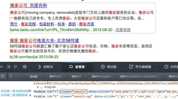 一、违禁词处理 百度处理违禁词是只处理词本身的,也就是说菜鸟们搜索“X榴”、“X榴地址”搜不到神圣网页,但可以这样搜: X榴地址。 看到搜索结果还可以点快照,省去Google之苦。 二、开放平台 对于百度的数据开放平台,它的展现形式大多数时候和普通网页不一样,但仍存在无特殊样式的。如下图中的58同城搬家类目,即属于开放平台,比普通网页的排序更优先。 所以区分某搜索结果究竟是不是百度开放平台的,不能仅看网页的展现样式,还要看SERP的html源代码。 下图中,各搜索结果对应的table,其class为result-op的(open),都是开放平台的结果。(使用Firefox或Chrome的“审查元素”功能来查看) 另外,百度产品在同样的展现形式下,有部分属于开放平台,有部分和开放平台无关,这也需要以是否为result-op来区分。