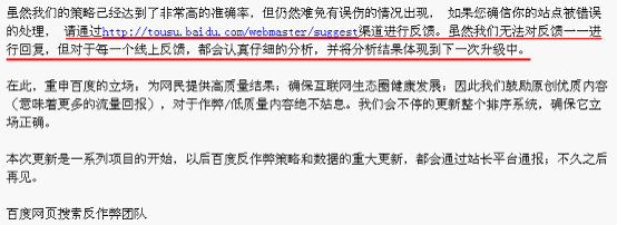 【图:lee所发表的《针对低质量站点的措施已经生效》】 B、seo业内普遍观点 1、网站大量的采集内容、伪原创内容,缺少真正意义高质量的原创。 2、网站过度优化或有作弊行为。(例如标题及首页关键词的堆砌,对于内锚、外链的作弊操作,对于搜索结果页面刻意点击。)此次过度优化重点打击的对象则为:内容只为搜索引擎抓取而提供,为了网站seo效果而提供毫无价值的内容。 3、对于老网站(或知名站点)长期占据首页排名,进行重新审核评定。 4、百度算法调整误伤网站。 5、网站连带责任影响较大(友情链接、同服务器)。 二、降低算法影响应对之策 结合百度官方以及seo业内普遍观点不难看出百度此次调整的侧重点还是再网站内容上。那么如果你的网站已经被k,或者网站降权比较严重,以下几点对应之策或许能助你一臂之力。 1、提高网站内容质量。这点永远是做百度优化的王道,同时也是最终留住用户的基石。 2、对于网站进行一个全面的体检。友链、服务器、站点内外作弊行为、站点内容因素……分析结果逐一解决。 3、如果是老站长期排名及权重较为理想,再本次算法调整中被降权,那么你首要去做的就是夯实内容,提高用户粘连度再访率。 4、对于站内优化的重视程度、力度必须提高,通过合理站内优化结合网站内容质量提升网站整体价值。 5、如果认为自己是符合《百度优化指南》进行白帽seo操作,那么你可以采用百度网页搜索反作弊团队给出的网页投诉地址。