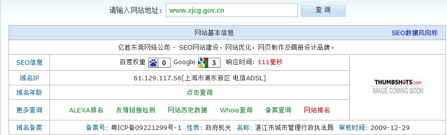 可以看到 百度权重:0 谷歌pr:3 性质:为政府机关 名称:湛江市城市管理行政执法局 以上就能说明一些问题了。 有人会说了,谷歌pr不是3吗? 我们从两个方面来分析这个问题。 第一:从备案信息来看,它的备案名称是湛江市城市管理行政执法局。 第二:我们从该域名的排名和收录情况看下。 收录情况