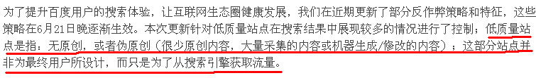 昨天百度对6.28事件进行官方说明,其中说到了低质量站点的标准的解释。所谓的低质量站点是指:无原创,或者伪原创(很少原创内容,大量采集的内容或机器生成/修改的内容);这部分站点并非为最终用户所设计,而只是为了从搜索引擎获取流量。