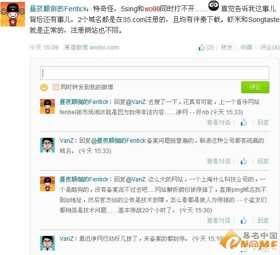 图:微博信息 据网友 @昼夜颠倒的Fentick 新浪微博称,“特奇怪,5sing和wo99同时打不开,直觉告诉我这事背后还有事儿。2个域名都是在35.com注册的,且均有伴奏下载。虾米和Songtaste就是正常的,注册网站也不同”。查询易名中国whois系统得知,注册于2004年1月的域名wo99.com,现已遭到注册商厦门三五互联科技的暂停解析处理,域名状态为clientHold。
