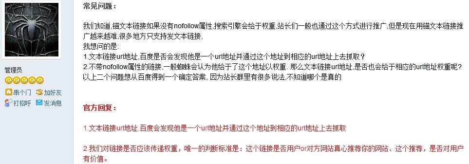 百度官方在《谈外链判断》及其他多个场合都表示过,一个链接是否传递权重,都是以该链接是否有真正的推荐意义为判断依据。如图所示为百度搜索工程师在“百度站长社区”中的相关回应:“我们对链接是否应该传递权重,唯一的判断标准是,这个链接是否是用户 or对方网站真心推荐你的网站、这个推荐是否对用户有价值。” 在站内链接优化中也提过“具有推荐意义的链接”。理想状态下,搜索引擎也应该只参考这种具有推荐意义的链接。但是网络上链接复杂,搜索引擎会怎样从技术角度来确定这个链接是否具有推荐意义呢?最能体现出被用户或对方网站真心推荐的链接方式就是文章内部自然出现的链接和用户分享的链接。并不是所有的文章内部链接都具有推荐意义,这个链接必须出现得自然,并且当前页面和被链接页面的内容应该有一定的相关性,这种可以引起用户点击过去浏览的链接才算具有推荐意义。由于现在用户分享行为也存在大量作弊现象,所以用户的历史操纵行为及用户分享出去的链接的受关注度,都可能成为这个分享链接是否具有推荐意义的参考。