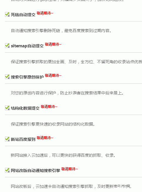 卢松松消息,百度云加速预计要6个功能,每个功能完全抓住屌丝站长心理,从收录、搜索结果展现,很多功能都来自百度站长平台,功能各个都很诱人,两个部门合并了吗?