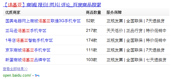 从 图中我们就可以看出,国美电器网上商城的搜寻流量比例是很高的(3C电器排行第一的京东是11.9%、苏宁易购也是在11.8%),而更重要的是我们看到 右手边的搜寻关键字排行,前面几个都是大型品牌的关键字,有做电子商务网站SEO的朋友就会知道,这一类的关键字要挤进搜寻排行榜中不是件简单的事情,因 为竞争实在是太强烈了。 我们实际拿其中一个关键字到百度去进行搜寻一下,结果除了品牌自己的广告及官方网站外,出现了这样的一个框框: