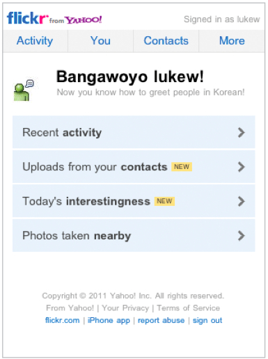 flickr的移动网页体验符合人们为什么而掏出手机(虽然略显生硬)。 配合移动环境使用环境自然也需要适应你网站真实世界的需要。因为移动体验可能被用在任何地点场景,你需要考虑如何让人们无论在哪里都觉得好用。 这就意味着需要考虑用户真正需要你网站组织提供的真实用例(use cases)。之前我曾经写过一篇《利用人物角色来做信息架构》其实就是通过分析用户完成某任务的流程来进行网页上的信息架构。这一点其实在手机端更加重要。 通过了解以上用户会掏出手机的动机,结合自身app提供的功能,尽量减少用户在移动端的操作路径。 内容优于导航 一条常规理论,在移动端内容优先于导航。无论人们是否经常查看更新信息,诸如:股票,新闻或是比分;他们查看当地新闻或是通过搜索查找文章或是使用聊天工具,他们都想快速响应需求而不是看到你的网站架构脉络。 太多的移动网页体验(像是之前的Flickr )开始时的对话都是一大堆的导航列表,而不是内容信息。移动端用户时间很宝贵,下载也需要流量的金钱消耗,所以让他们马上获得想要的信息才是关键。
